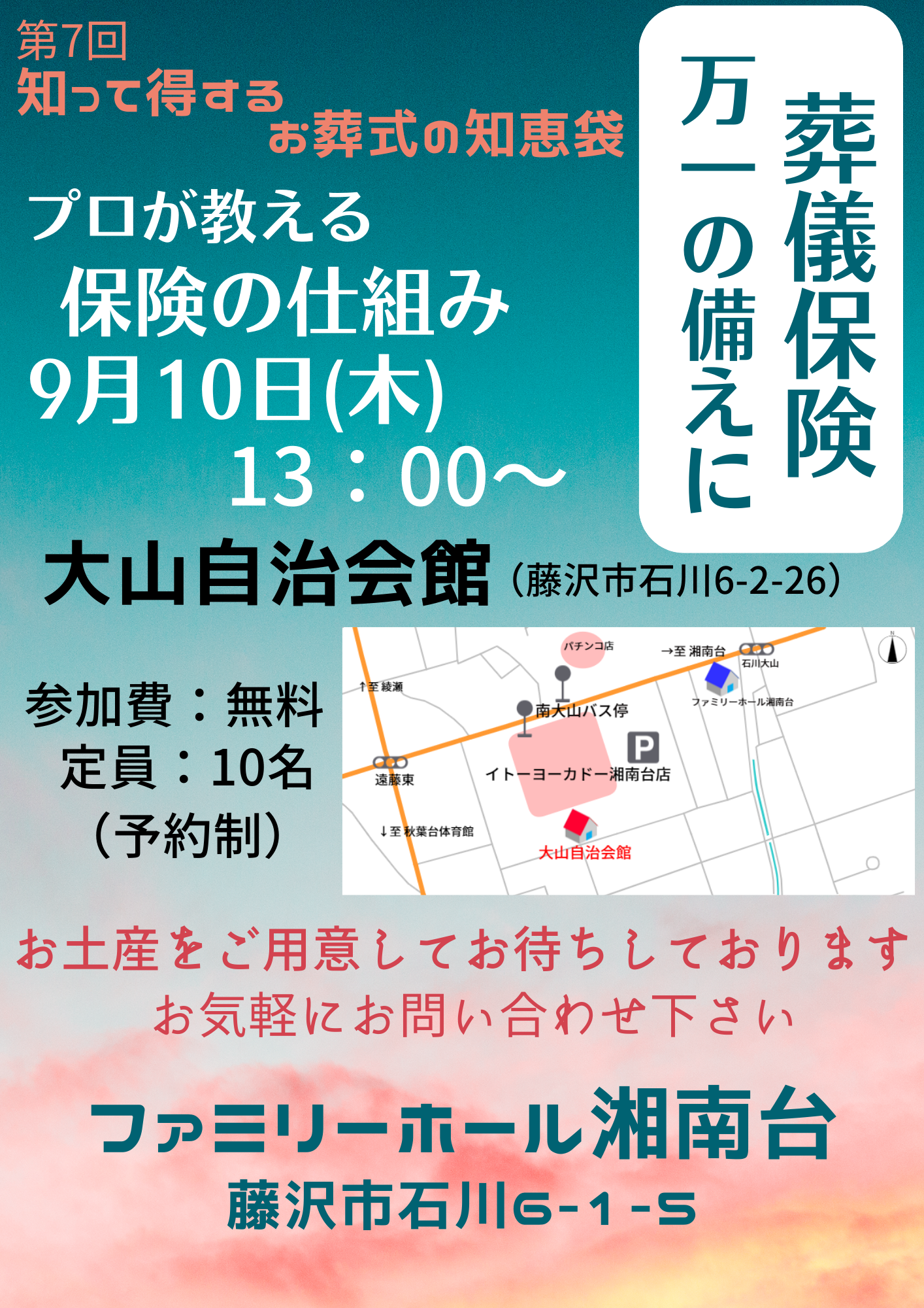 下記の日程にて『第7回 知って得するお葬式の知恵袋~プロが教える保険の仕組み~』を開催いたします。