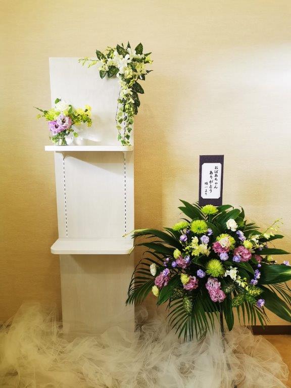 ご安置期間寂しくないように お花で設えた祭壇を飾ります。 棚には写真や愛用品を置くことができます。