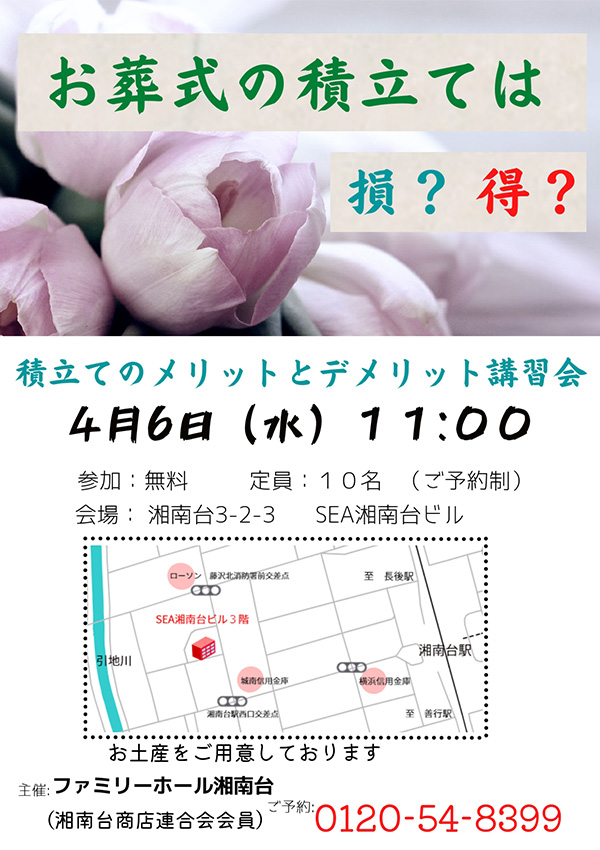 【開催間近】お葬式の積立て、メリットとデメリット講習会開催のお知らせ ~4月6日(水)11時~